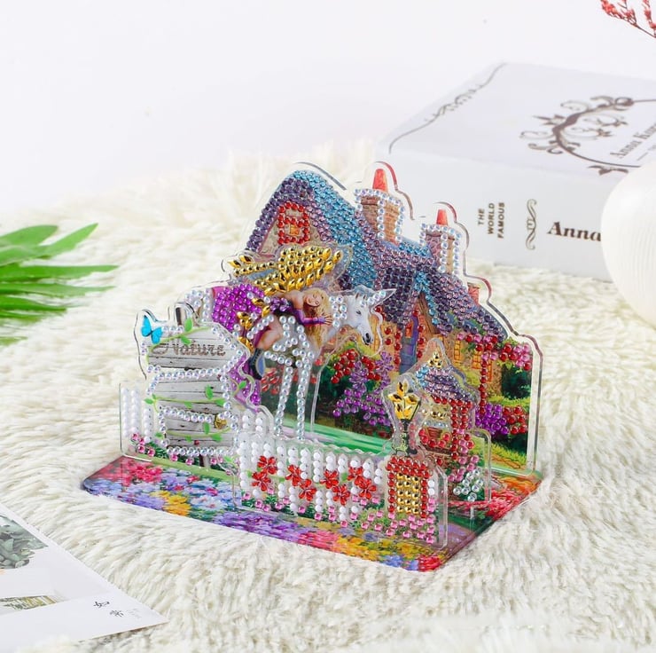 3D DIY Colourful Unicorn Cottage Diamond Art Kit Crystal Embroidery Rhinestone 15cm x 15cm Acrylic Table Top Stand