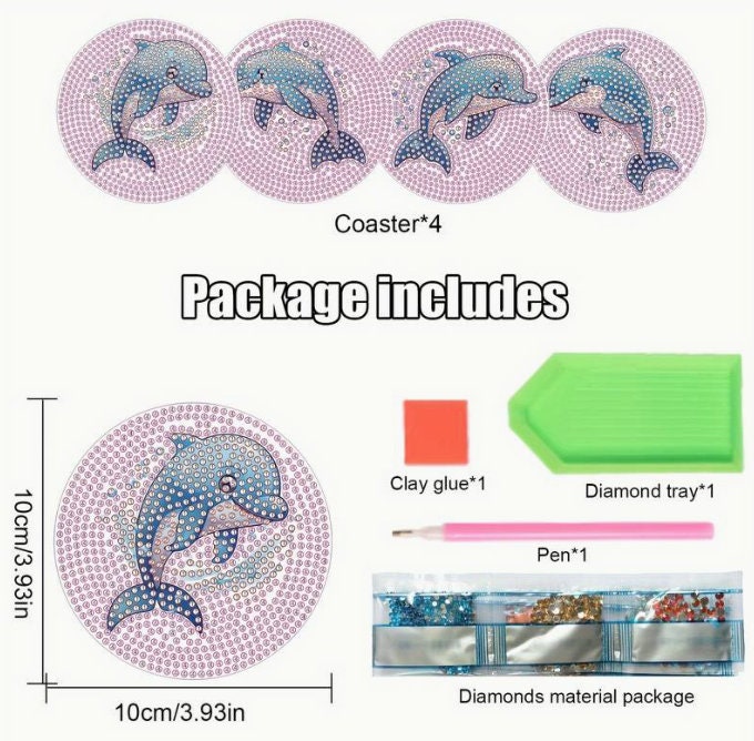 Each Pack contains 4 wooden coasters, 1 clay glue, 1 pen, 1 tray and a set of rhinestones.