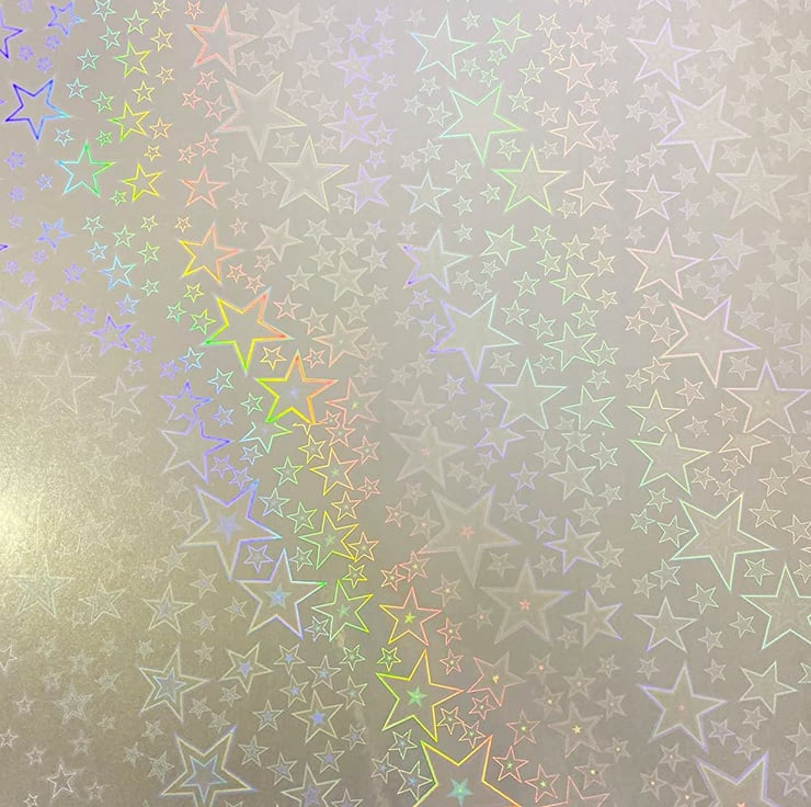 Beautiful Transparent Holographic Self-Adhesive Vinyl Overlay In Holographic Stars Pattern. Pack of 10 Sheets