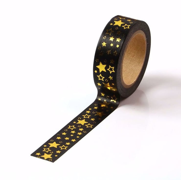 Black With Gold Foil Stars Washi Tape Decorative Masking Tape. Quality foil washi tape. Black washi tape with gold foil embossed stars