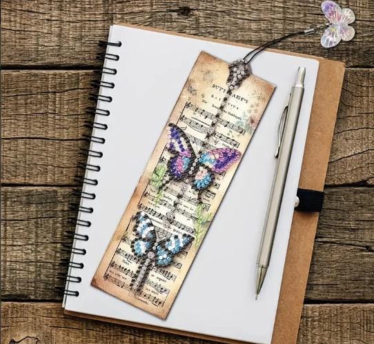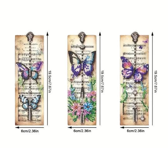 Includes 3pcs 5D DIY Vintage Butterfly Sheet Music Diamond Art Bookmarks templates, butterfly charm tassels, a diamond painting pen, a square of glue, a tray, and many different coloured quality diamond rhinestones
