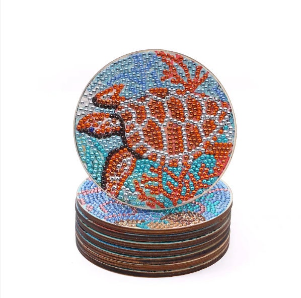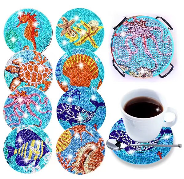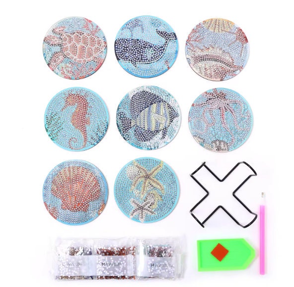 The Sea Creature Coasters Kit is a delightful 8-piece set featuring 5D diamond art coasters with vibrant, ocean-inspired designs. Each coaster showcases a unique sea life theme, such as colorful fish, starfish, and marine plants, all brought to life with sparkling rhinestones in a diamond embroidery style.