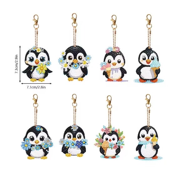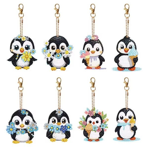 8Pcs 5D DIY Assorted Cute Penguin Diamond Art Keyrings by Numbers Kit for Adults & Kids, Round Crystal Double Sided Embroidery Rhinestone Craft Pendant for Keys, Gifts, Phone, Bag, Christmas Tree Ornament Numbers for Arts and Crafts