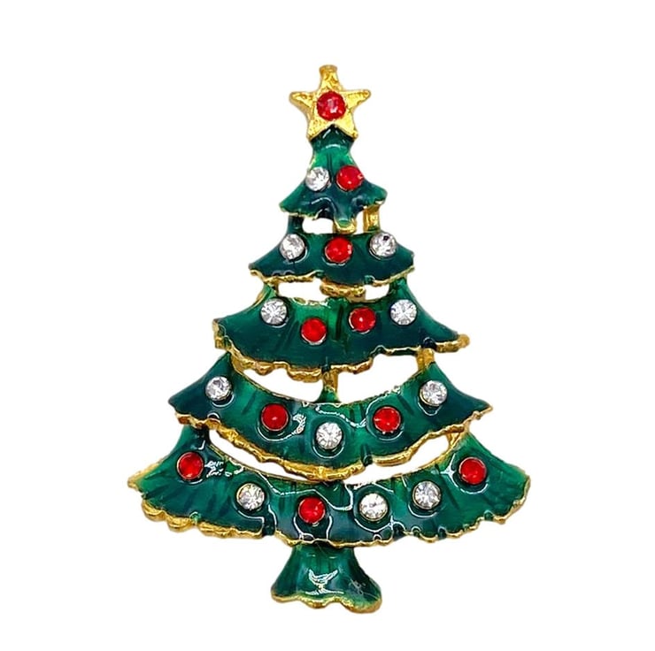 Green Christmas trees with red and silver rhinestone baubles and a gold star on top