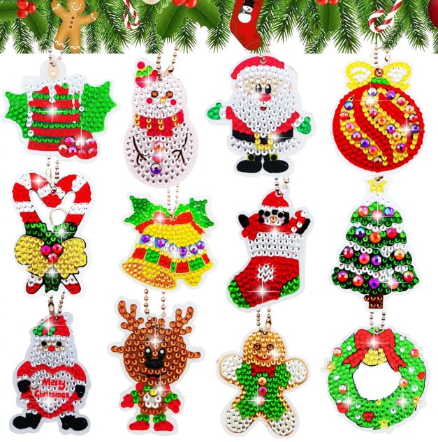 Includes 12 Assorted Cute Christmas Design keyring templates, keyring chains, a diamond painting pen, a square of glue, a tray, and many different coloured quality diamond rhinestones