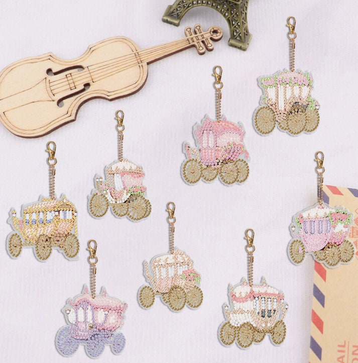 8pcs 5D DIY Assorted Cute Fairy tale Carriages Diamond Art Keyrings by Numbers Kit for Adults Double Sided Rhinestone Craft Pendant
