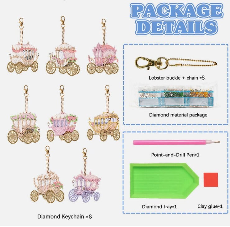 Includes 8pcs 5D DIY Assorted Cute Fairy tale Carriage Design keyring templates, keyring chains, a diamond painting pen, a square of glue, a tray, and many different coloured quality diamond rhinestones