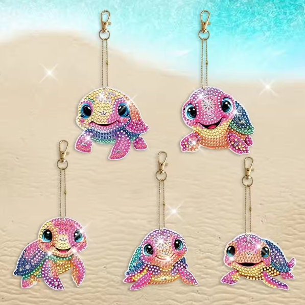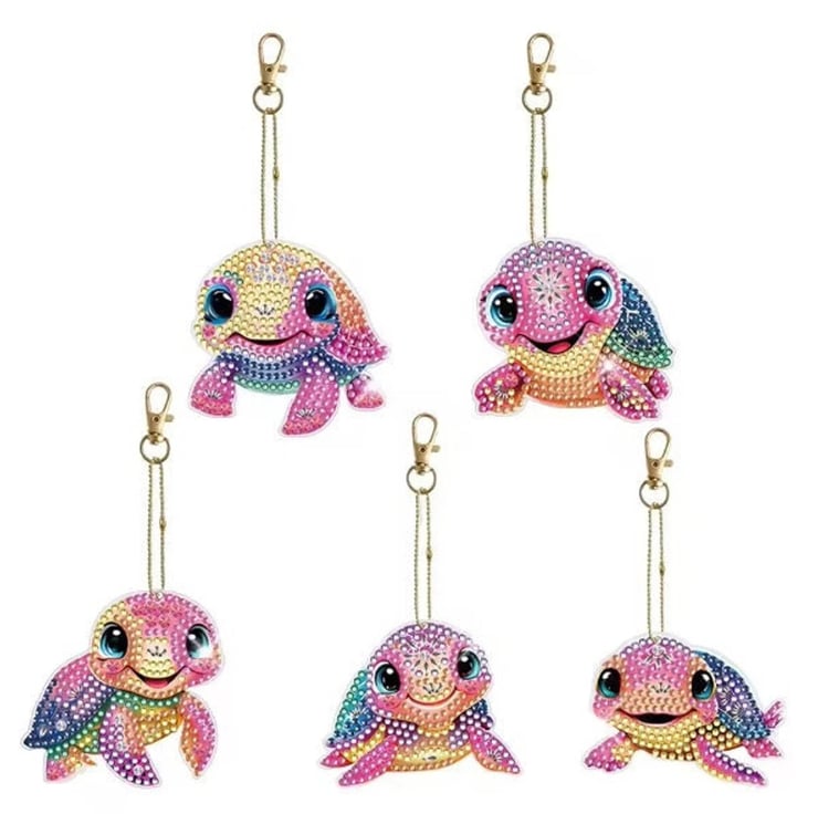 Includes 5pcs 5D DIY Assorted Colourful Turtles Design keyring templates, keyring chains, a diamond painting pen, a square of glue, a tray, and many different coloured quality diamond rhinestones