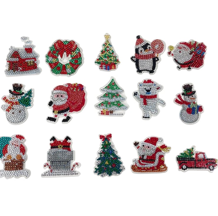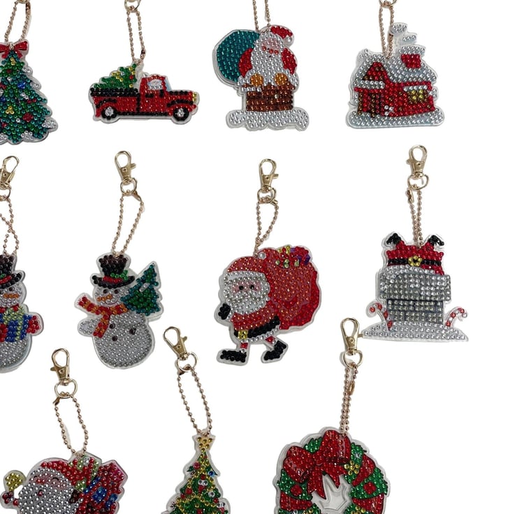 Includes 15 Assorted Christmas Design keyring templates, keyring chains, a diamond painting pen, a square of glue, a tray, and many different coloured quality diamond rhinestones