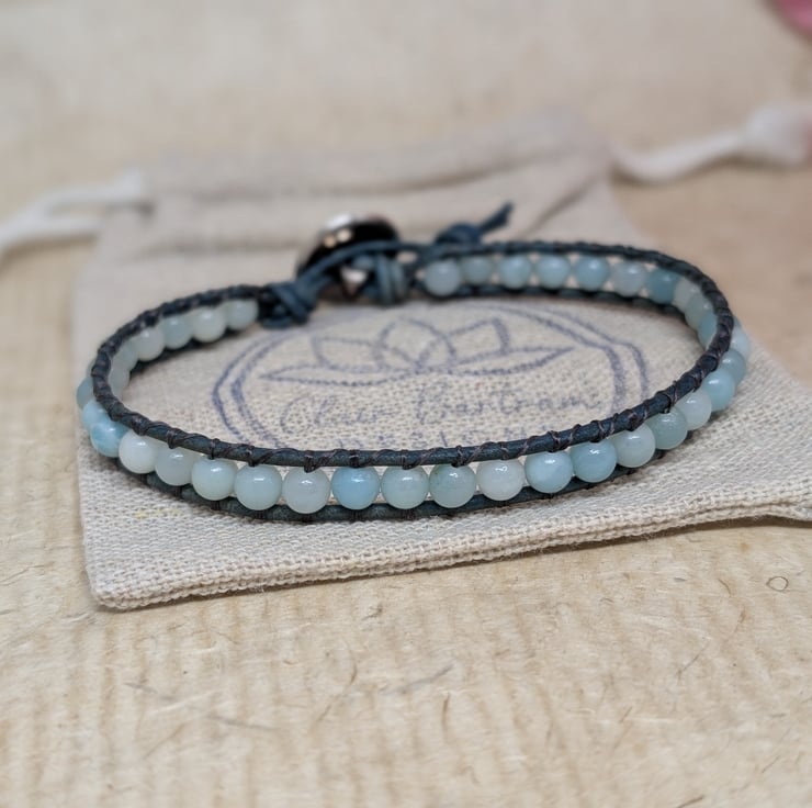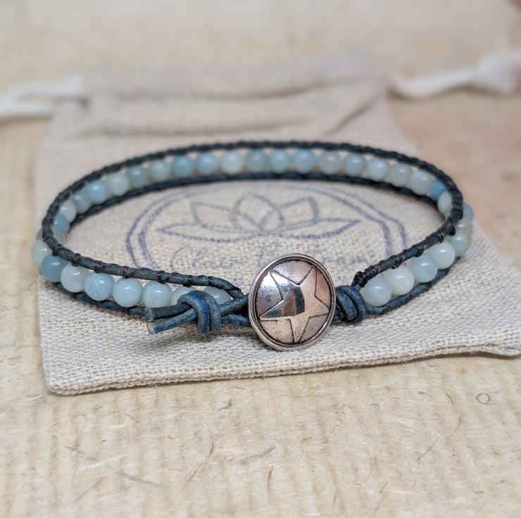 This dainty bracelet features palest blue semi precious amazonite beads, attached to distressed blue leather cord. It fastens with a silver coloured button which has a star motif.