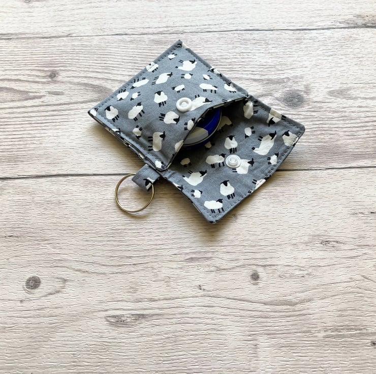 Sheep round tin lip balm grey fabric keyring, keychain, Lipstick holder.