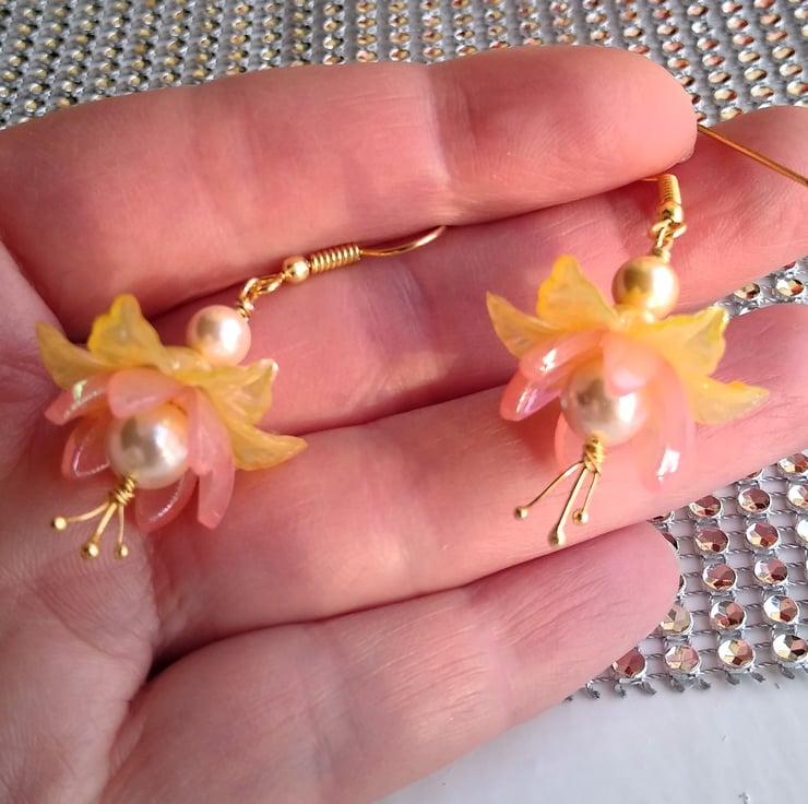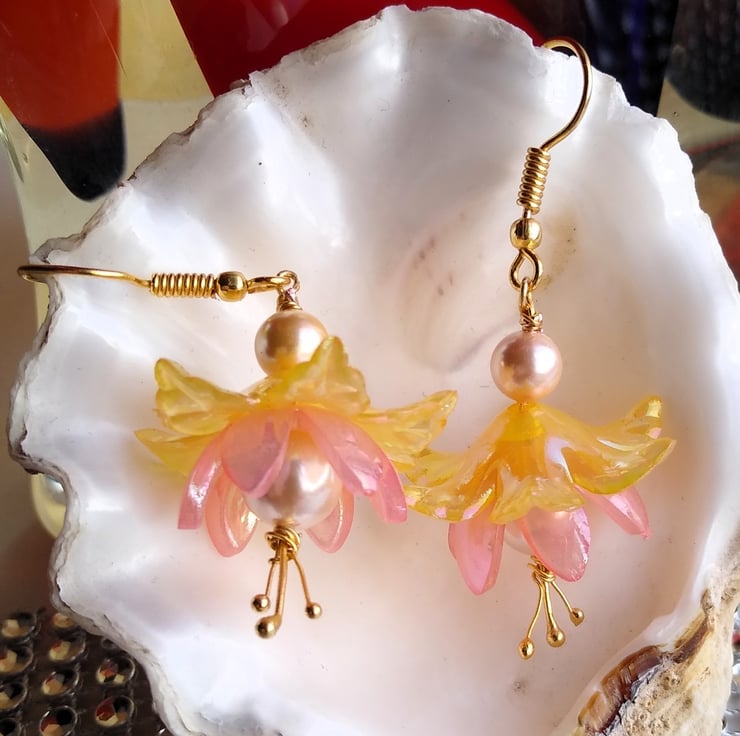 Spring fresh iridescent yellow and peach fuchsia style flower drop earring. Handmade with champagne coloured shell pearls and gold plated ear wires. Extremely light weight they can be worn all day and night. An elegant and feminine look to any spring or summer wardrobe, ideal for those summer garden parties and BBQ's or wedding party. Drop length 50mm approx