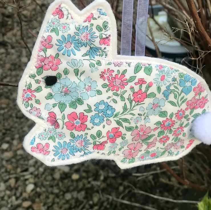 A charming Easter bunny rabbit in Liberty fabric and felt. The bunny has a ribbon to hang and is in pretty pinks and blues