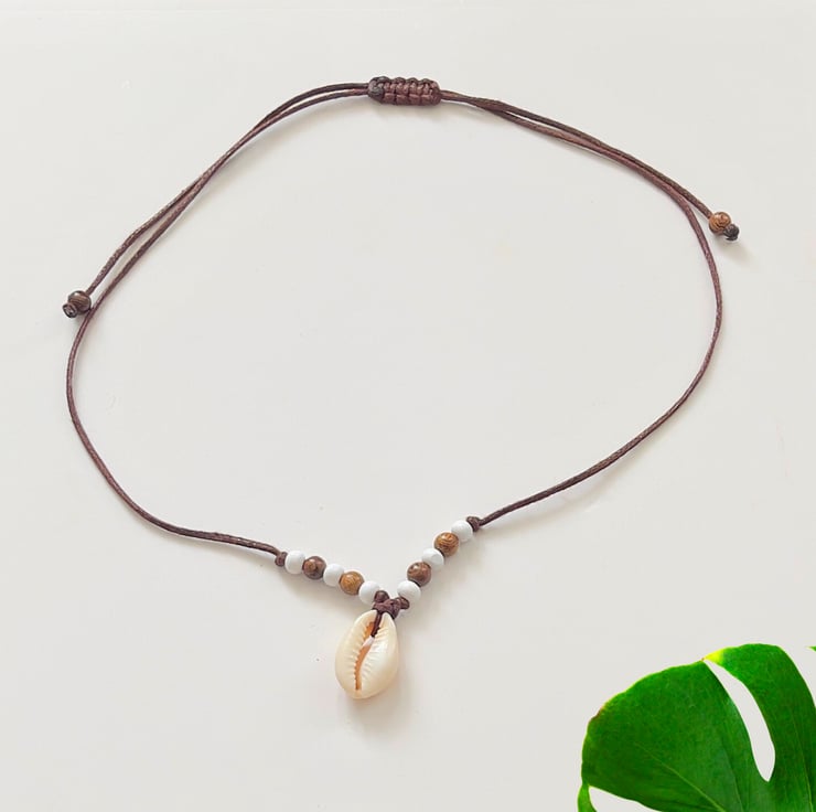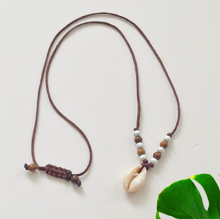 Surrounding the alluring cowrie shell are handpicked wooden beads measuring 6mm each, adding an earthy contrast to the smooth texture of the shell. These beads are threaded onto a durable waxed cotton cord that promises longevity and comfort during wear.