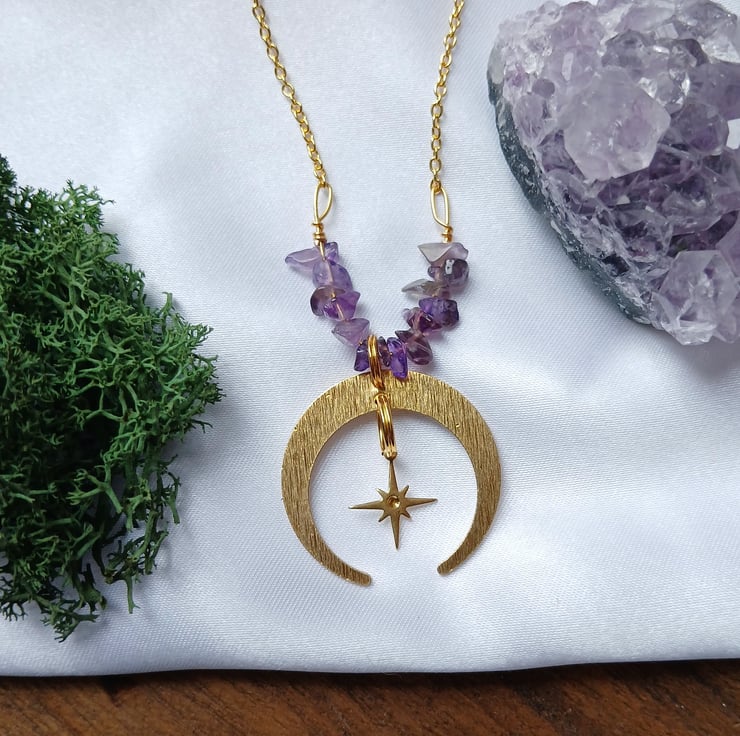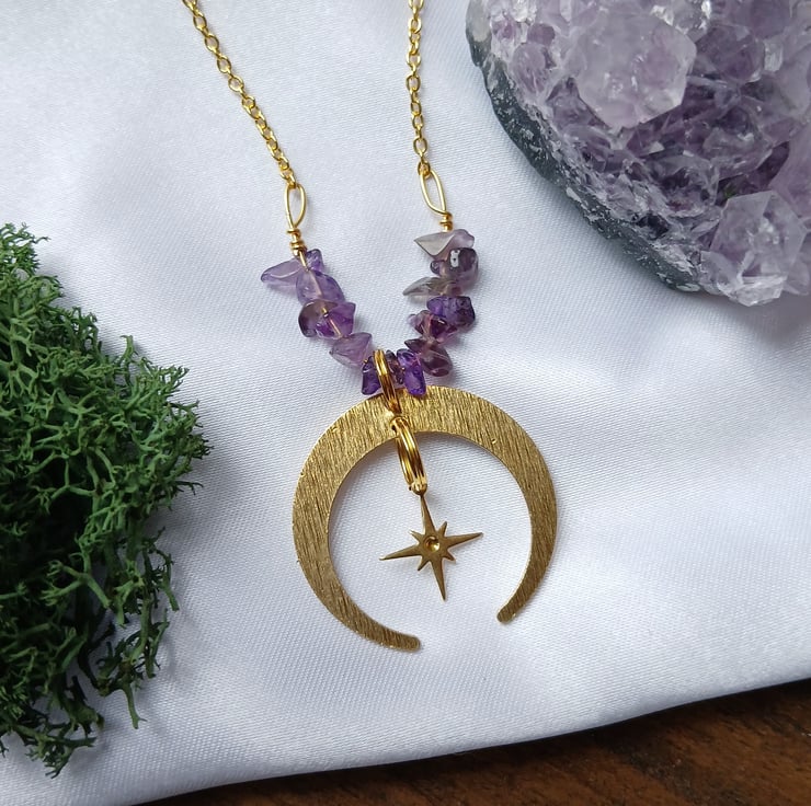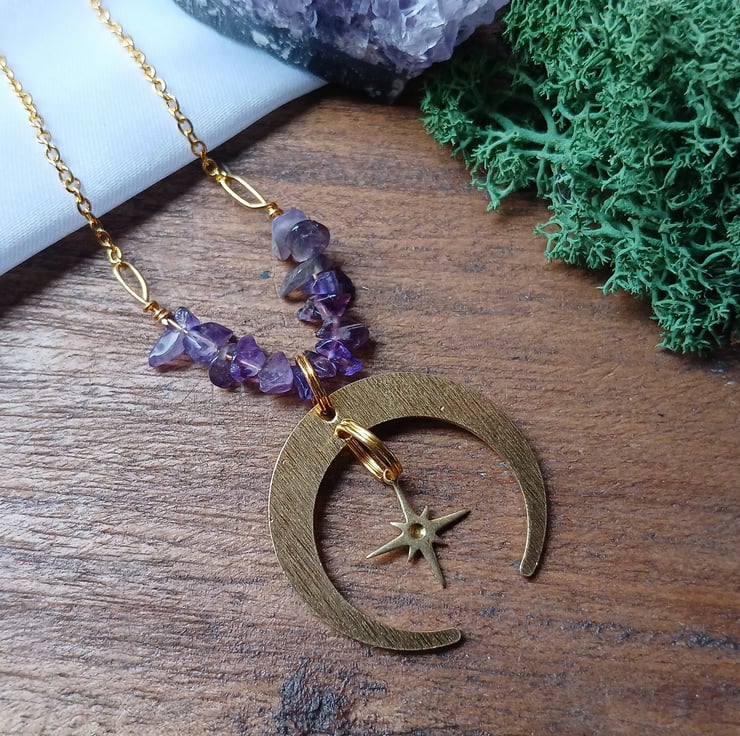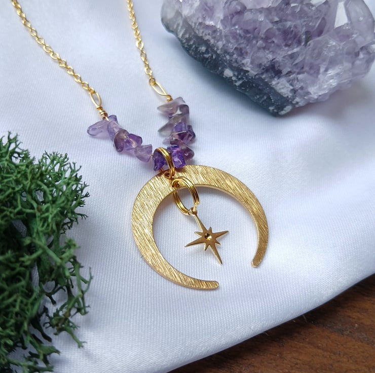 Handmade Whimsigoth Crescent Moon & Star Amethyst Necklace – Gold Plated (55cm)