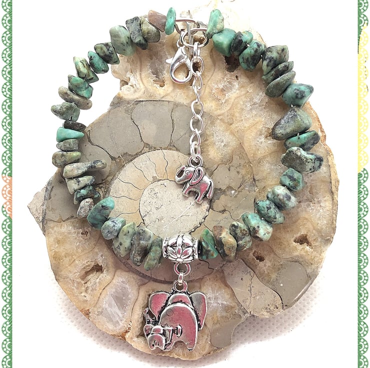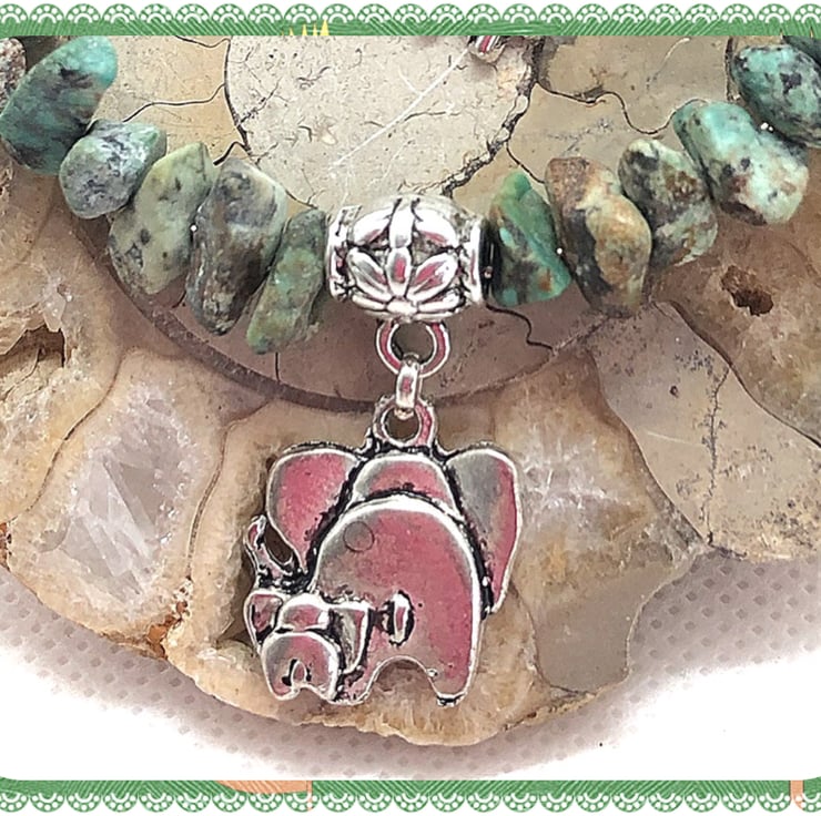 Created using this Tibetan silver Mother Elephant and calf charm charm connected to a Tibetan silver bail, I’ve threaded African turquoise gemstone chips onto stainless steel memory wire, lobster clasp & extension chain with elephant charm Adult wrist size. Nickel free.