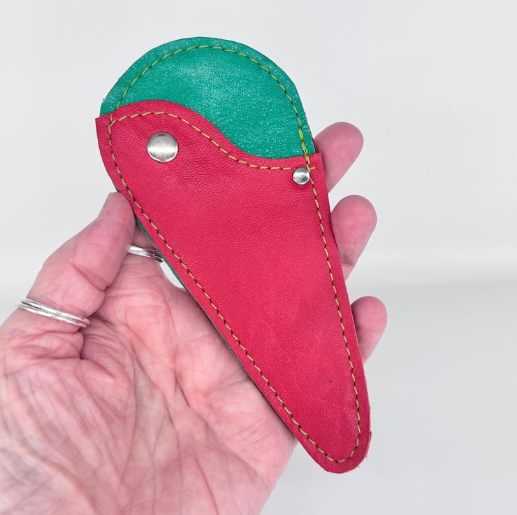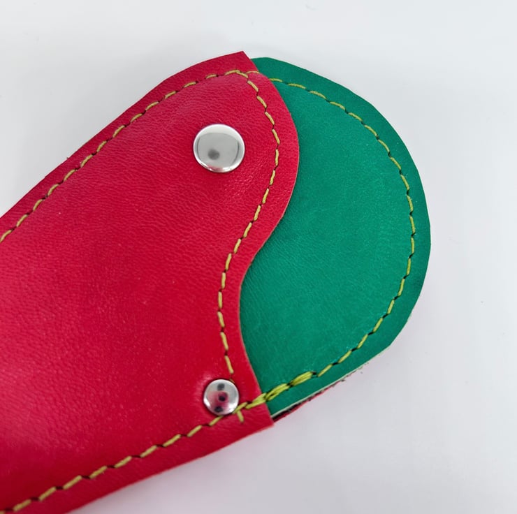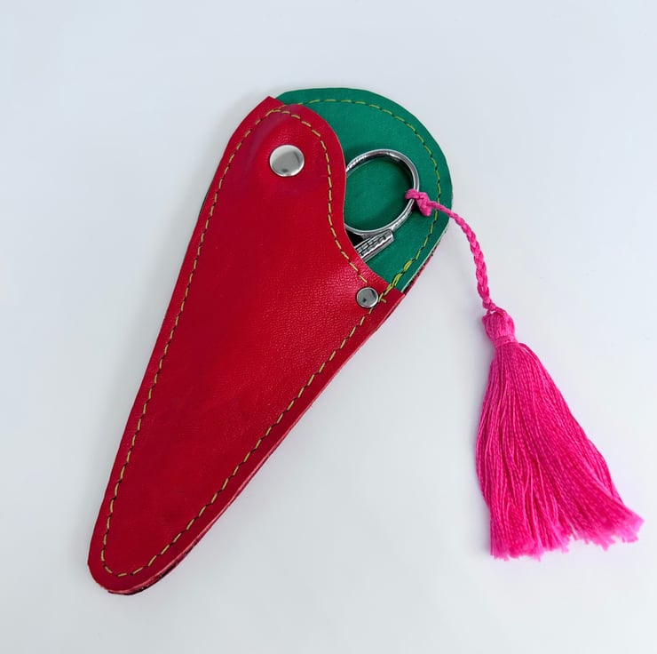 This red and green real leather scissor case has been especially made to hold embroidery scissors and other small scissors. The soft leather will keep your scissors safe and protected. Perfect for scissors no larger than 11.5 cms long.