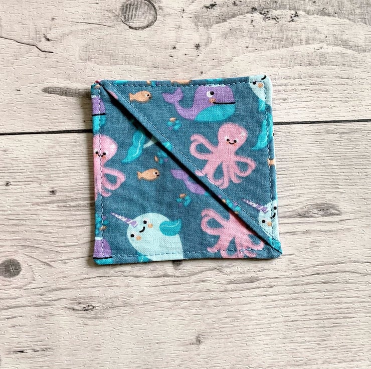 Cotton fabric corner bookmark, layered with interfacing and topstitched.