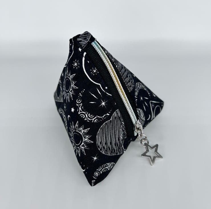 This pyramid D4 shape dice bag is made using black organic cotton fabric printed with lots of moons, stars and other celestial patterns.