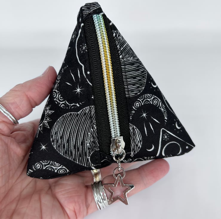 The triangle pouch has a zipper with a rainbow D20 metal zipper pull, not the star one that is shown in the photo. This size dice bag will fit a few sets of dice, perfect for anyone who plays RPG or for dice goblin friends. I have two different sized dice bags in my shop, this is the smaller of the two.