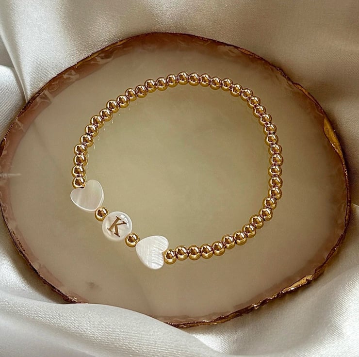 Handmade personalised bracelet made with 4mm 14kt gold filled beads which are tarnishproof and water resistant. This bracelet features a freshwater shell pearl letter bead with gold detailing framed by two pearl heart beads. This bracelet will make a stunning gift for a loved one, friend or yourself with that special personal touch.