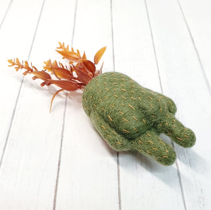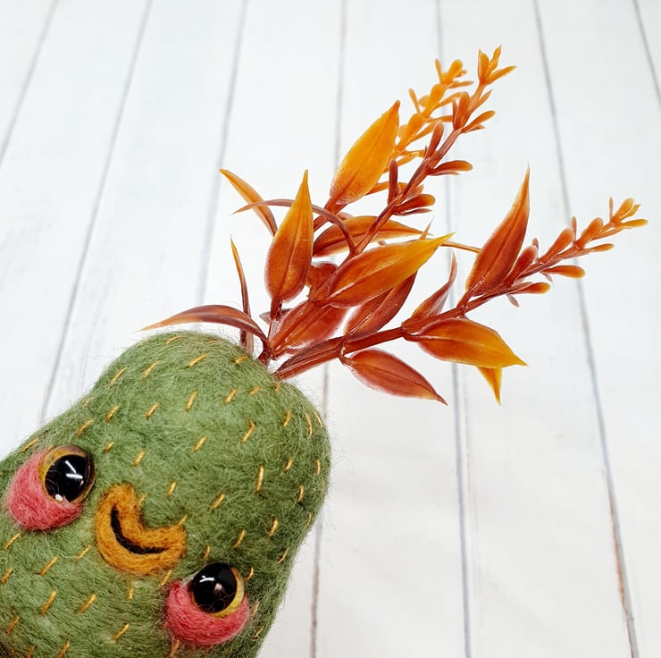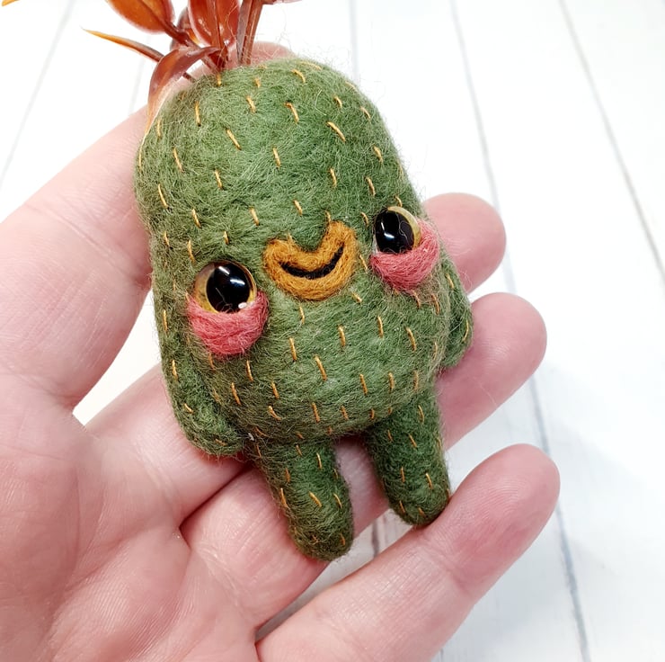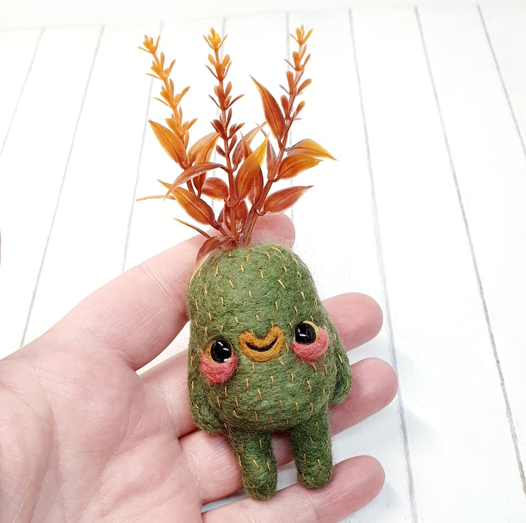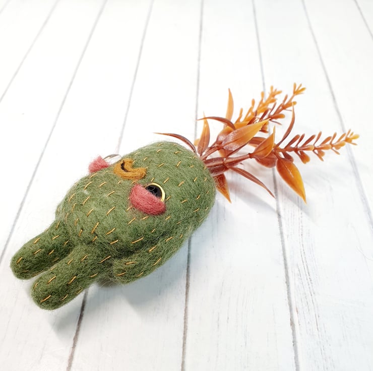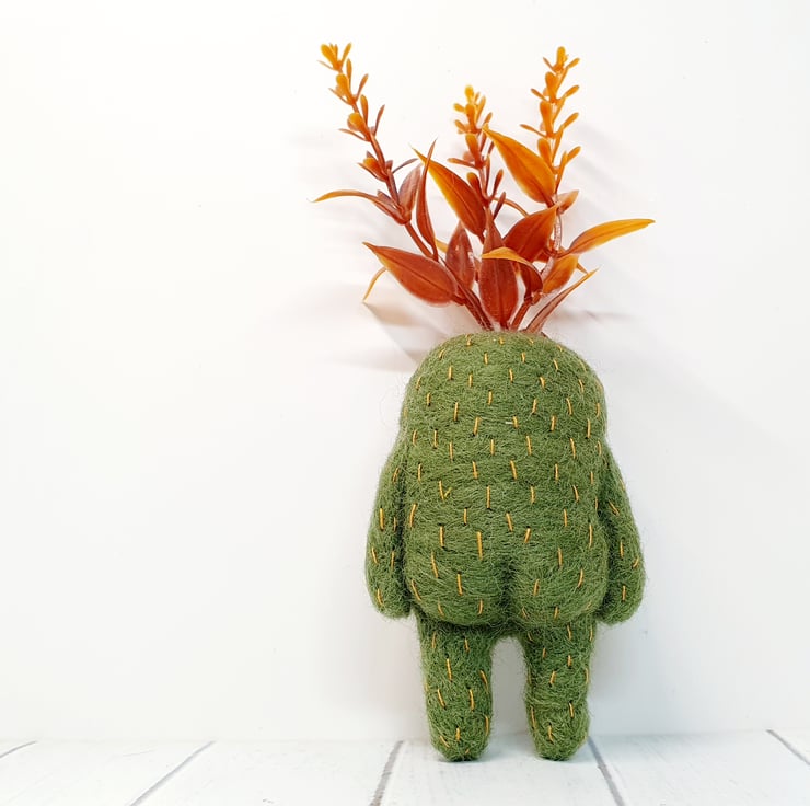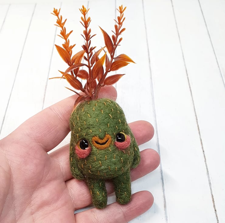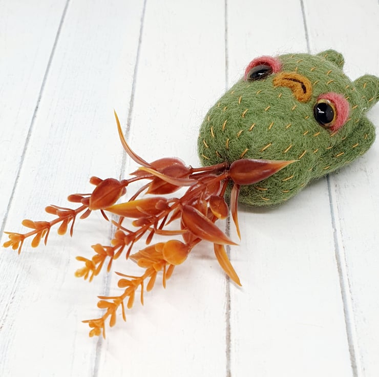 Needlefelted art doll with glass eyes and faux foliage atop its head. Swamp Creature has hand embroidered details and a cute little bum. Doll needs to lean against something in order to stand. Doll measures roughly 13cm tall.