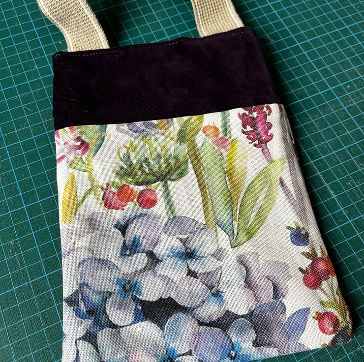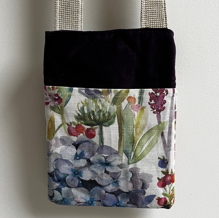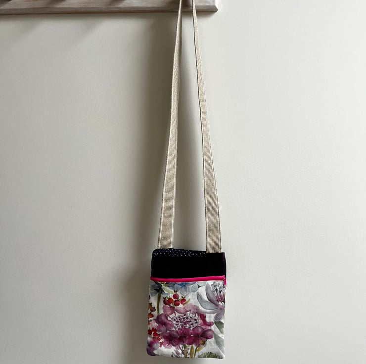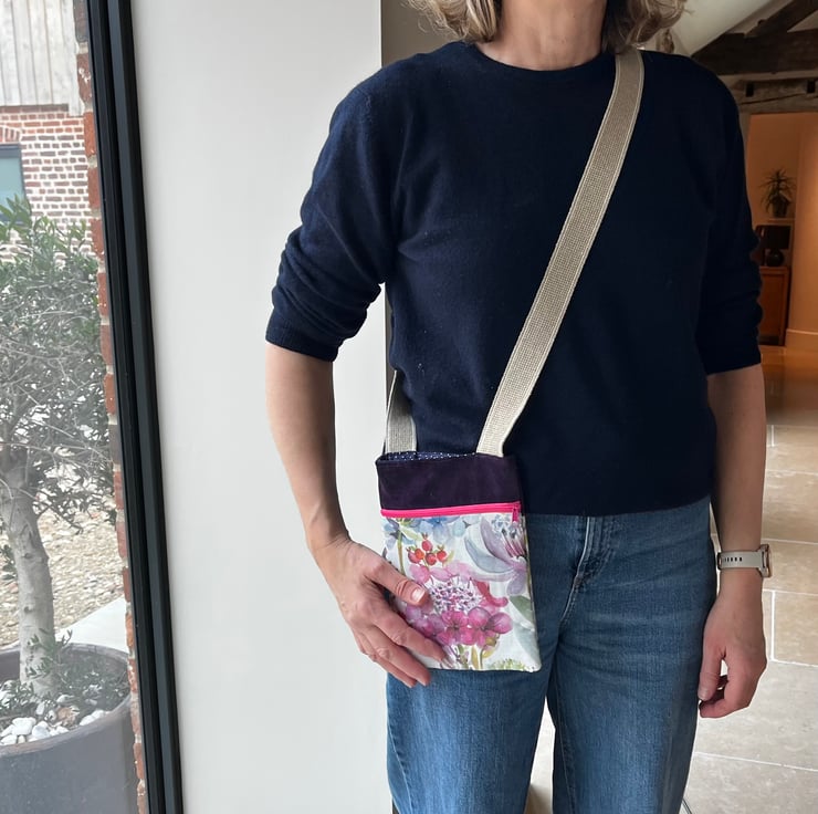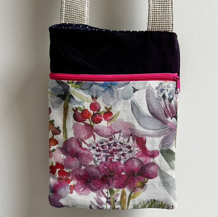 One of a kind cross body bag, perfect for holding your phone and keys when out for a walk. The bag has been made from purple needlecord from a soft sample swatch and pretty watercolour floral cotton. There is a zip pocket on one side and a patch pocket on the other. The bag fastens with a magnet snap and is fully lined with navy spotty cotton