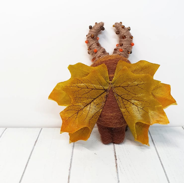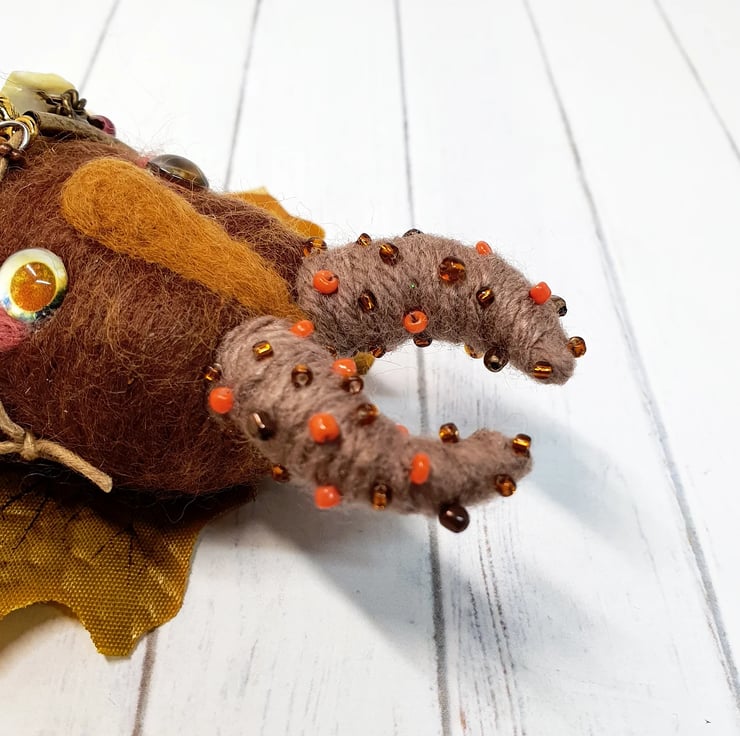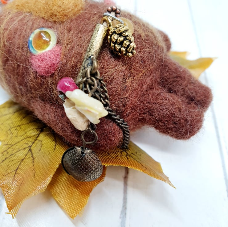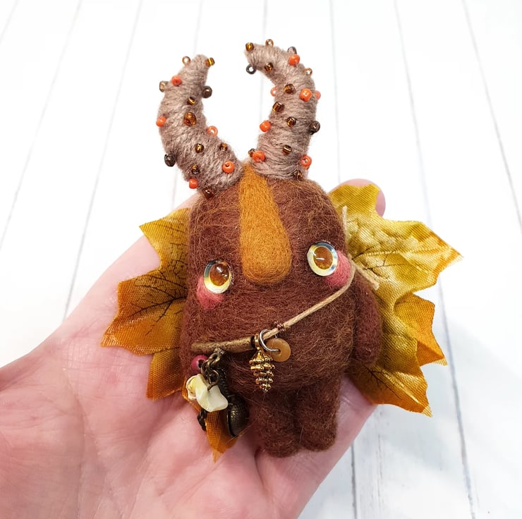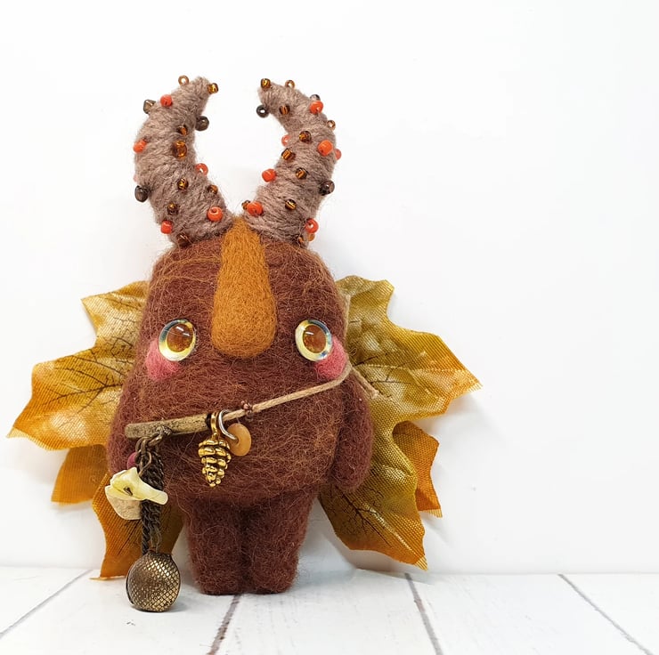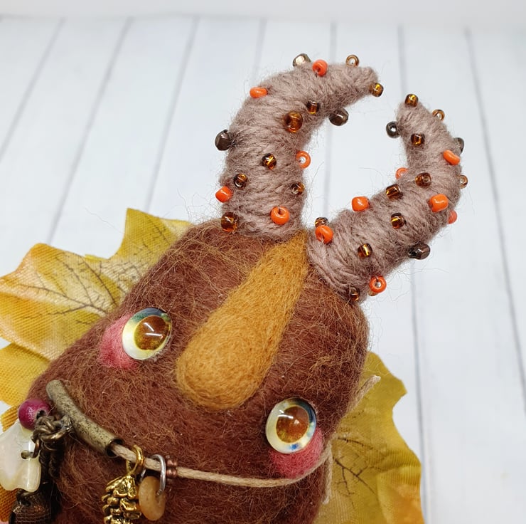 Needlefelted art doll with glass eyes and faux leaf wings. Swamp Protector has glass eyes and long nose. This doll has wired yarn horns decorated with beads and wears upcycled charms.
