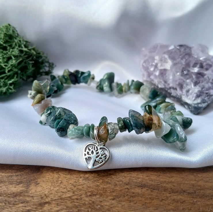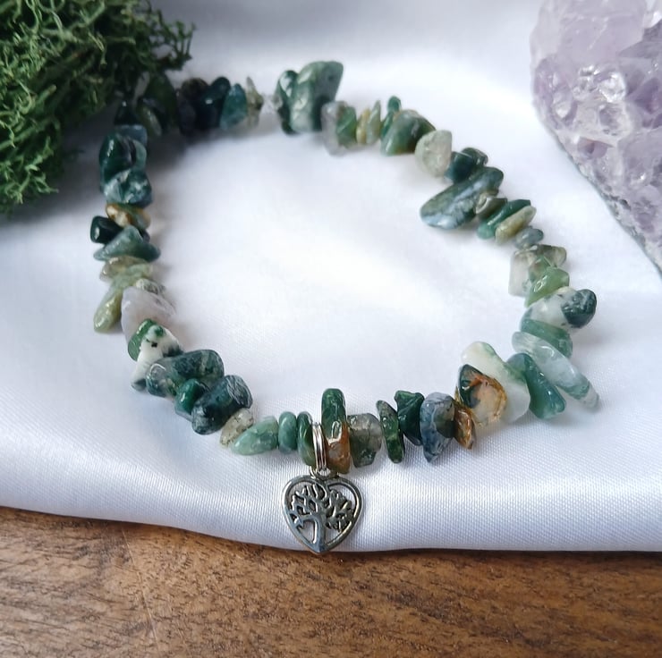Connect with nature’s magic with this handmade Moss Agate bracelet, featuring a heart-shaped Tree of Life charm, symbolizing growth, strength, and harmony.