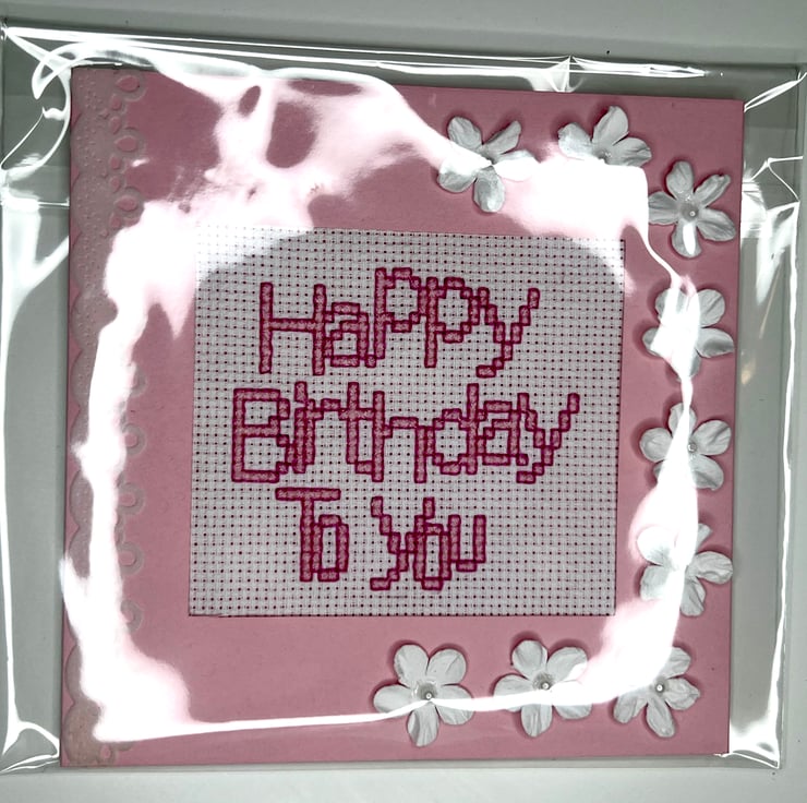Handmade cross stitched Happy Birthday card decorated with flowers.