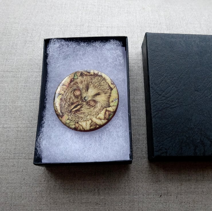 This charming ceramic brooch features my original artwork of a hedgehog asleep. It measures one and a half inches diameter and comes complete with a smart black box.