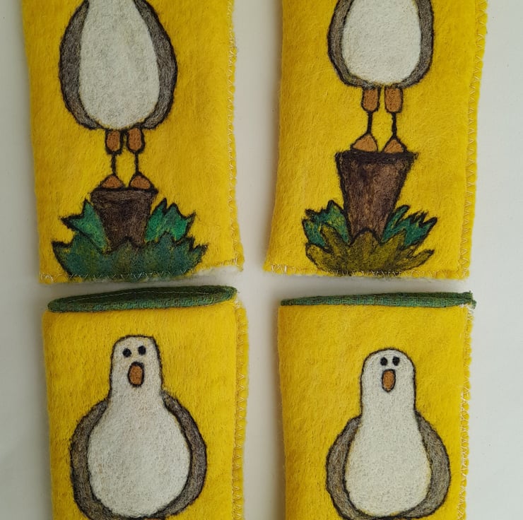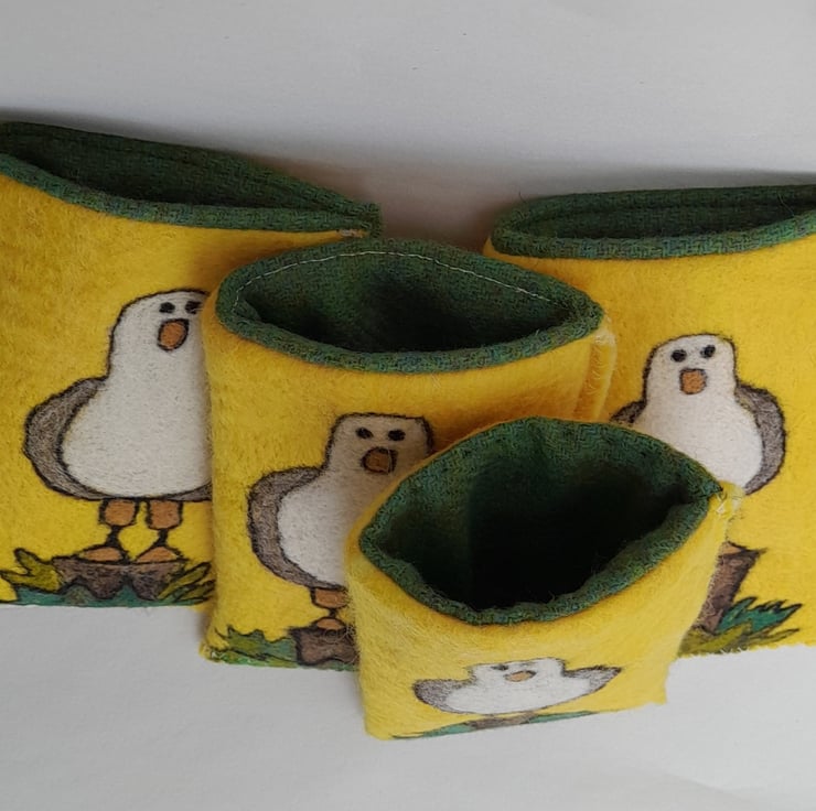 Wet felted handmade British wool glasses case with needle felted seagull character on the front. I have lined the case with a 100% wool green fabric lining, and it has been top stitched on the sewing machine.