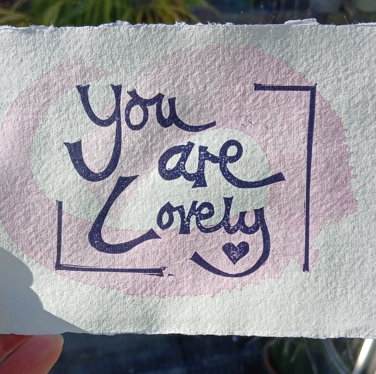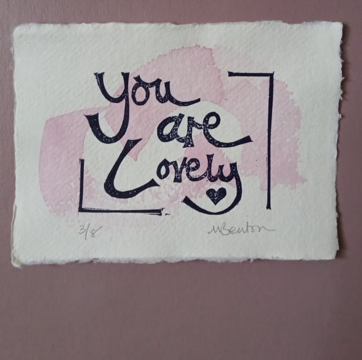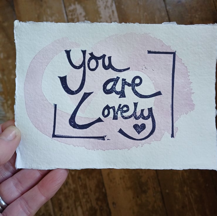 This little print was made in two stages, with the hand-carved linocut message ‘You are Lovely’, printed in a deep purple ink over a loose pale pink watercolour sweep of a heart.