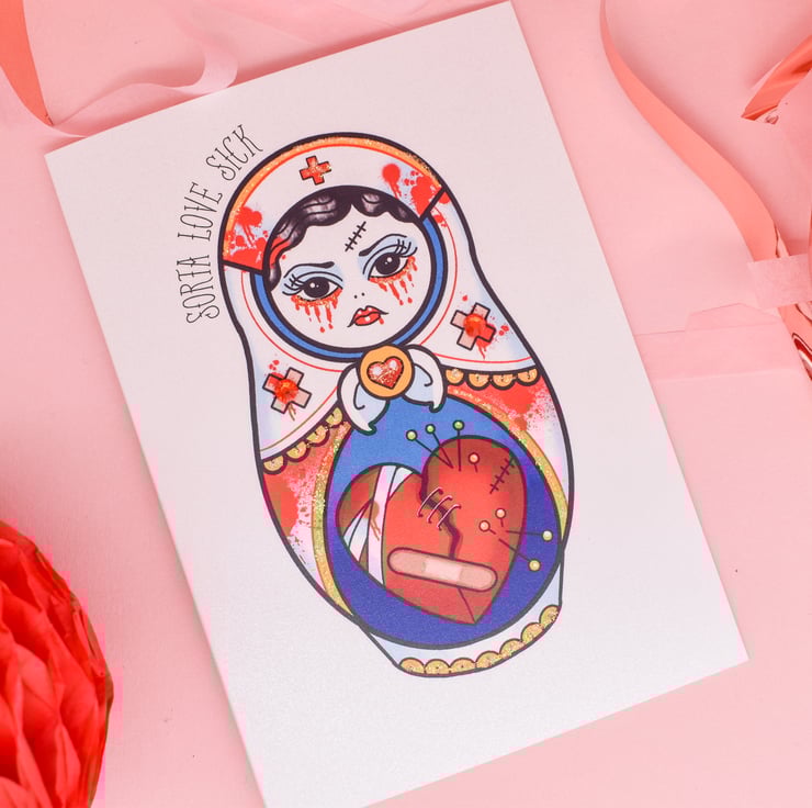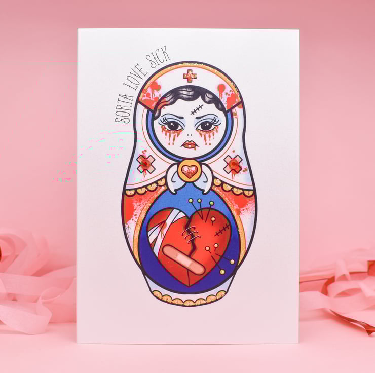 Handmade greeting card with tattoo illustration of a SORTA LOVE SICK bloody cute and creepy nurse Cute & Creepy doll dressed in white and blue with blood splatters and a broken heart in her belly. Drawn in Pro Create on the iPadPro then printed on a 300gsm Silica Blue white card with a dusting of blue shimmer. Hand trimmed, folded and decorated with a red gems and a sprinkle of blood red glitter.
