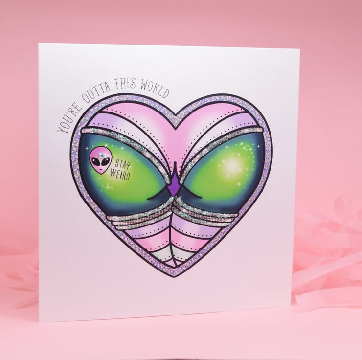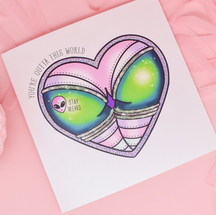 Dead cheeky handmade card with tattoo illustration of a green alien booty inside a space heart. She has an alien tattoo with the words "Stay Wierd wearing a pink space suit with glitter trim. Heart finished with the "You're Words Outta This World"