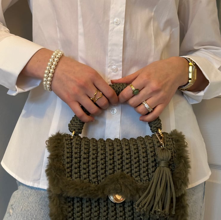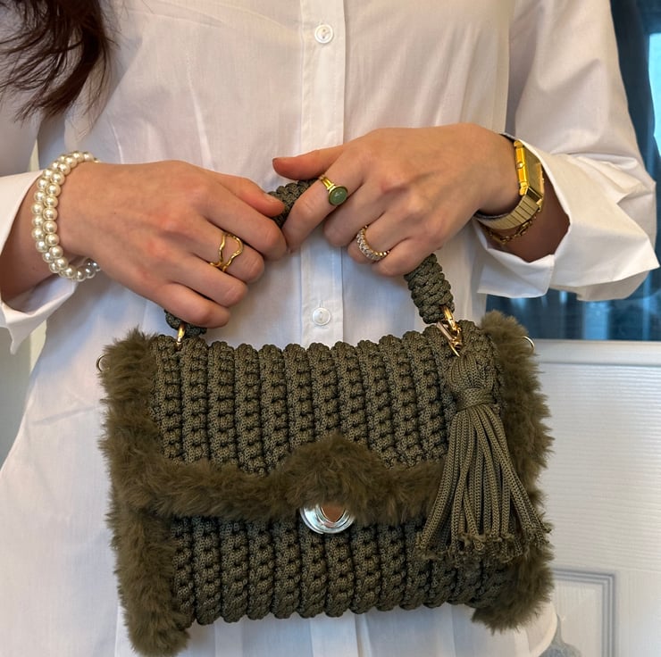This sweet crochet handbag in khaki a cozy fluffy knit detail around the edges. With a removable strap, it’s perfect for wearing as a crossbody or carrying as a handbag. Light, sturdy, and full of charm, it’s a lovely accessory for any occasion.