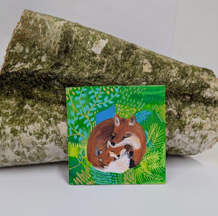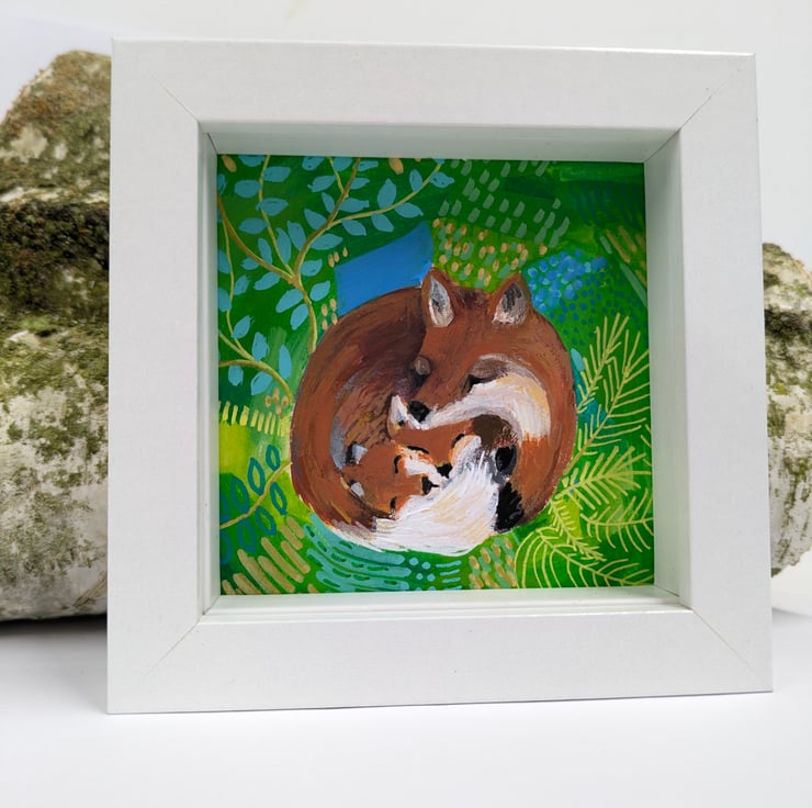 A little original painting of a fox and two little cubs snuggled together for a nap. Painted using acrylic paints completely unique and comes framed in a white box glazed frame. Great to fit in to a little space, gallery wall or to sit on a shelf.