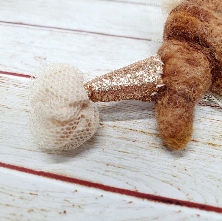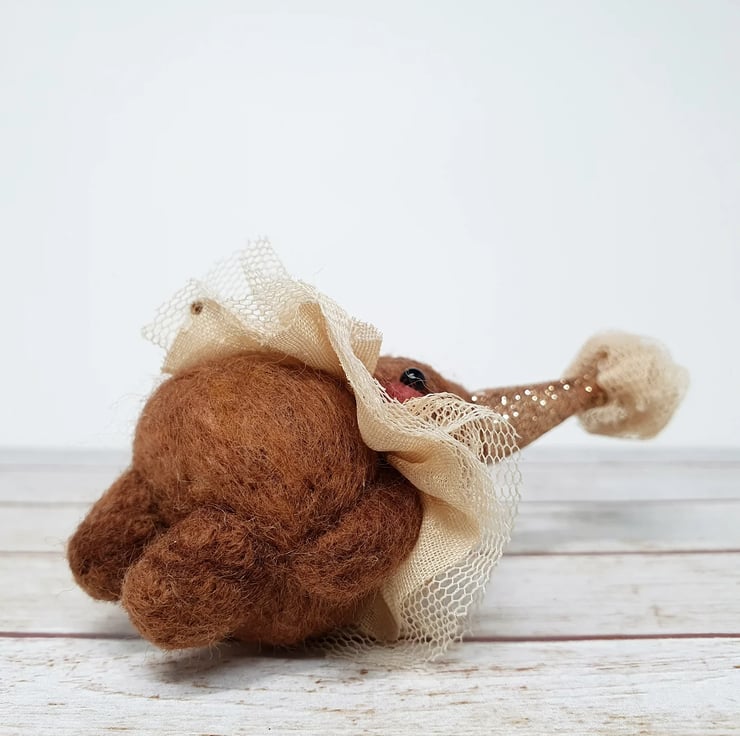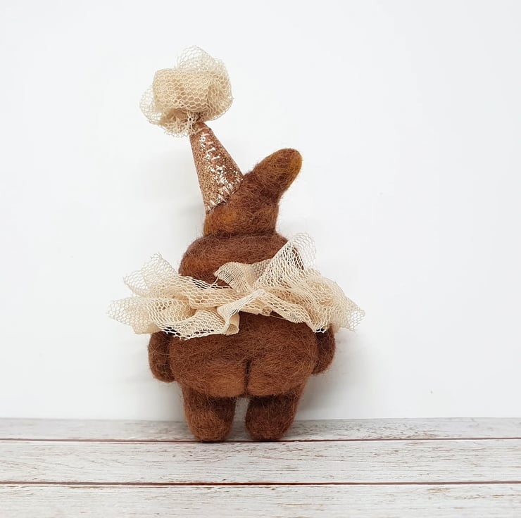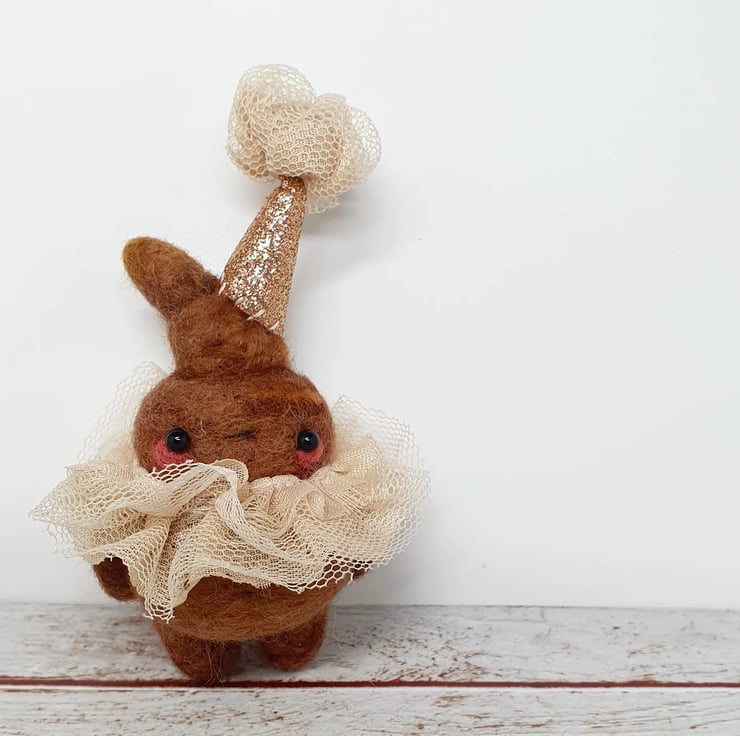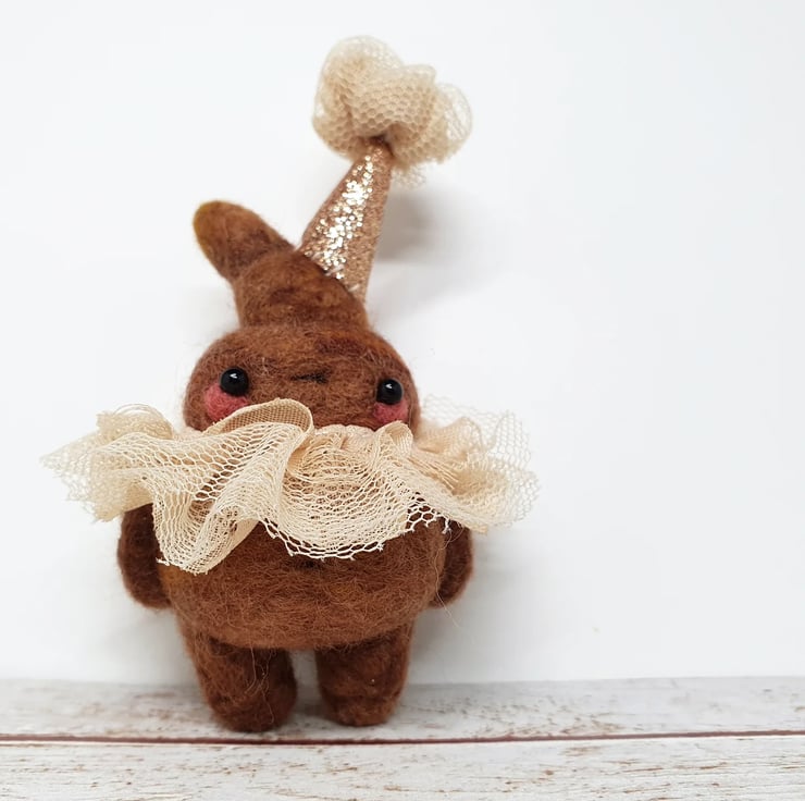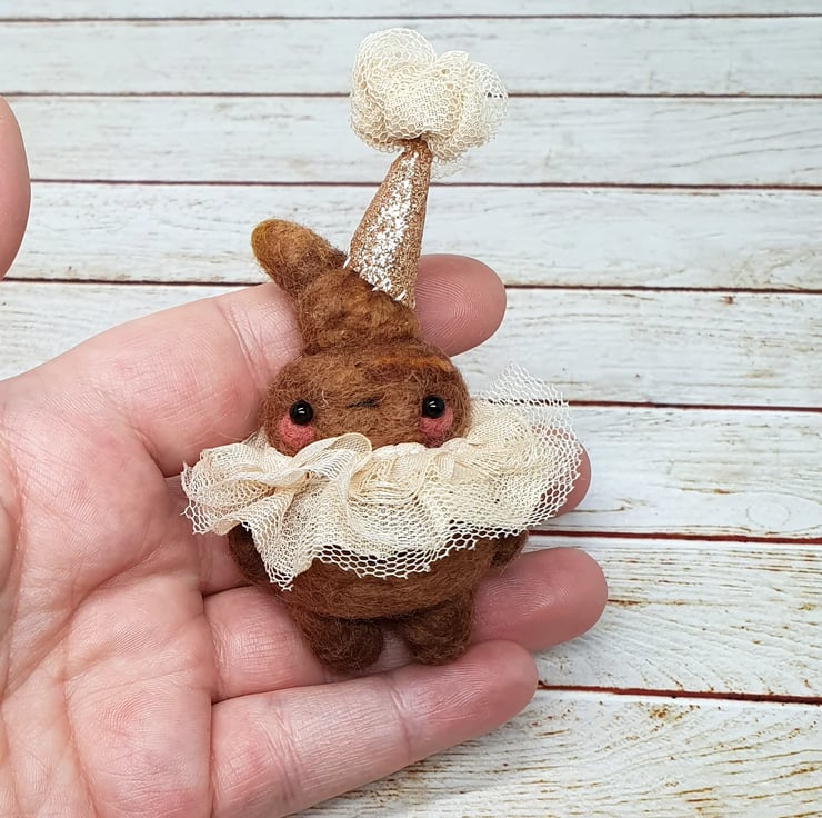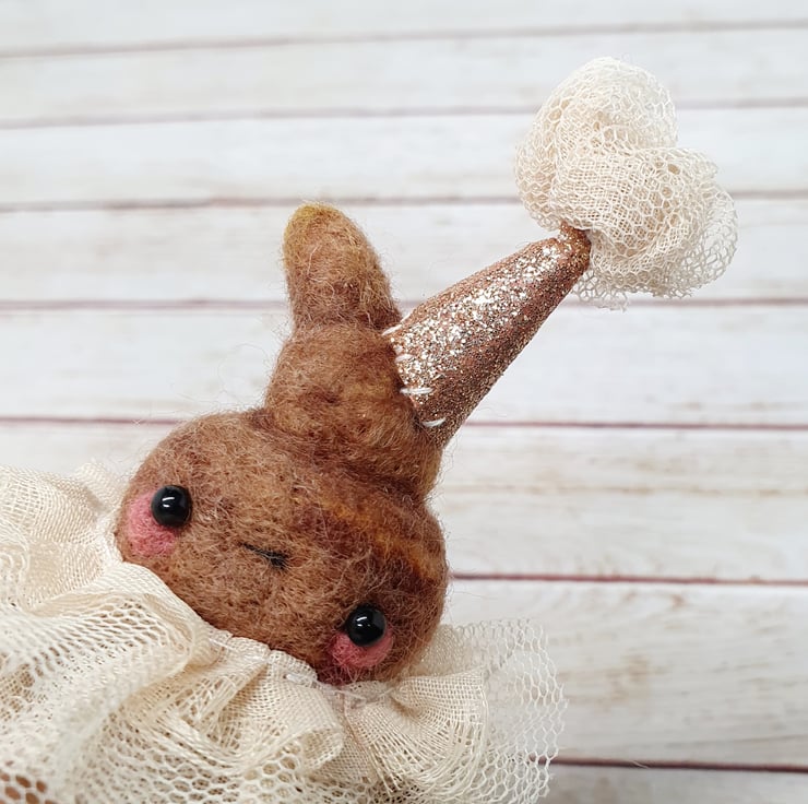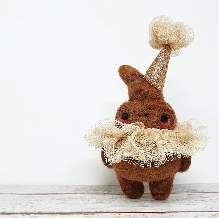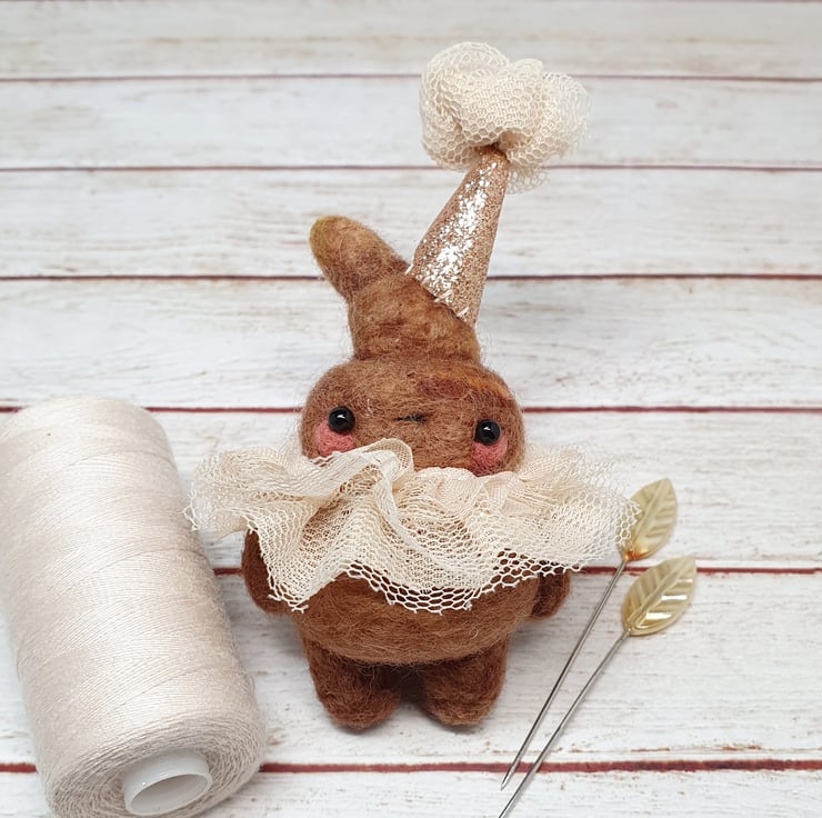 Needlefelted miniature art doll with glass bead eyes. This little pooper has rosy cheeks and a little bottom and belly button. They are wearing a hand stitched lace ruffle around their neck and a glitter party hat with complimentary ruffle pom on top. Cannot stand unaided and needs to lean against something. Measures roughly 10cm tall. This is for decorative purposes only and not a toy. Sent in recyclable or recycled packaging wherever possible. If you'd like your order tacked please also add tracking to your basket.