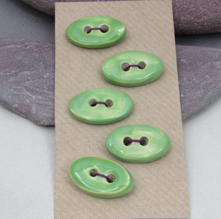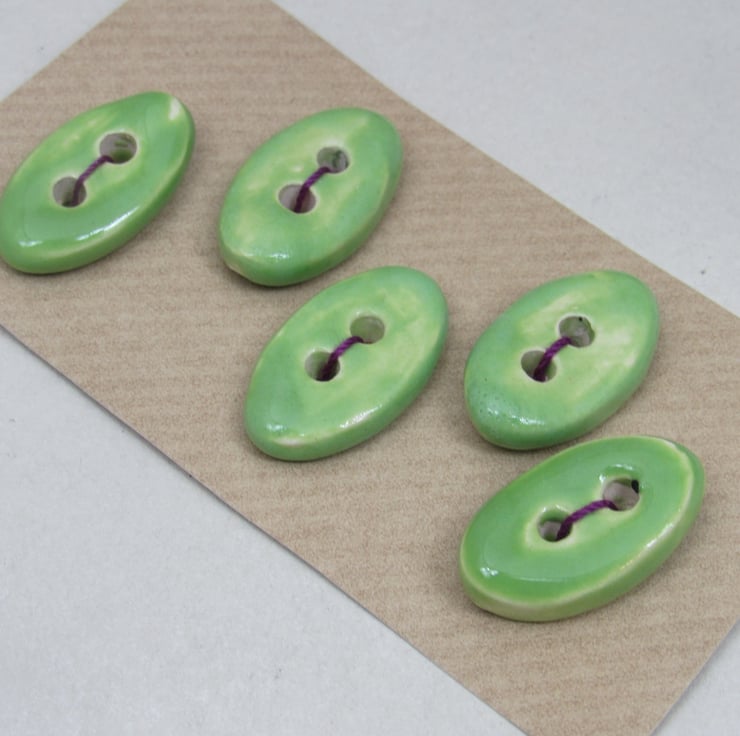 5 small oval stoneware buttons finished with a bright apple green glaze