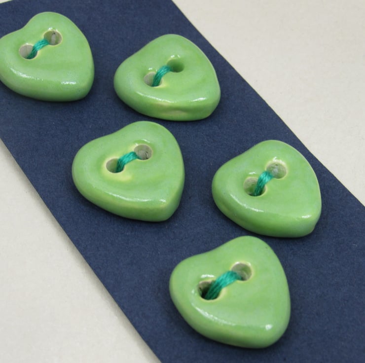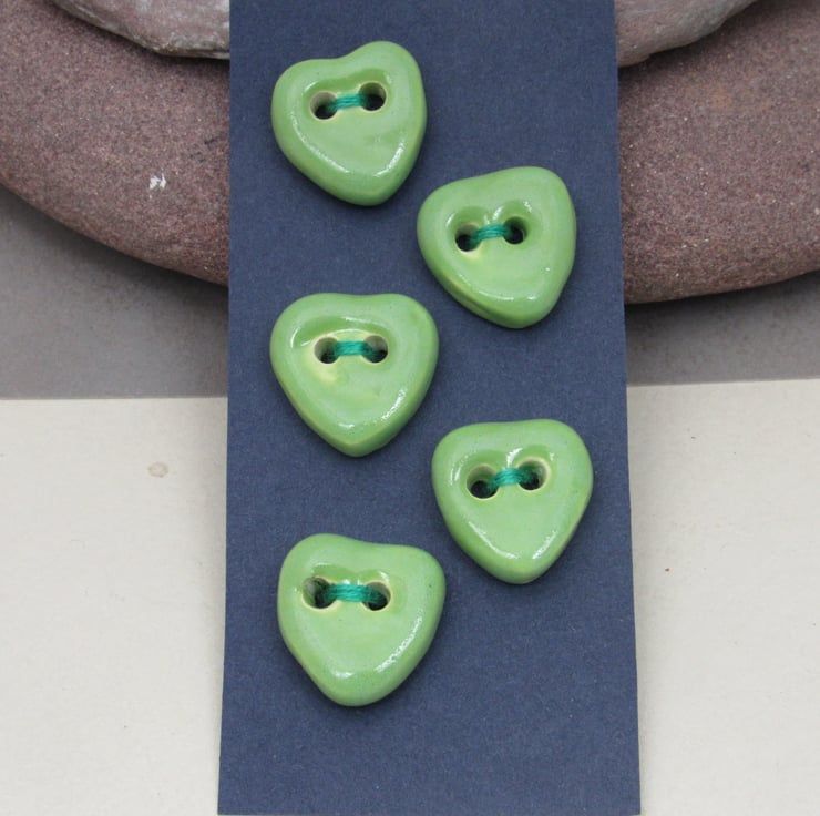5 small stoneware heart buttons finished with a bright apple green glaze.