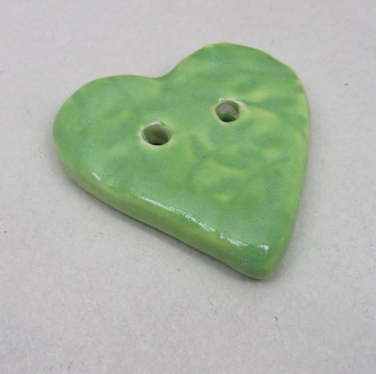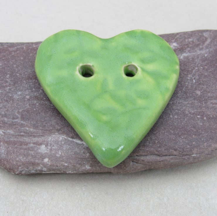 Medium heart shaped stoneware button, textured with a delicate leaf motif.