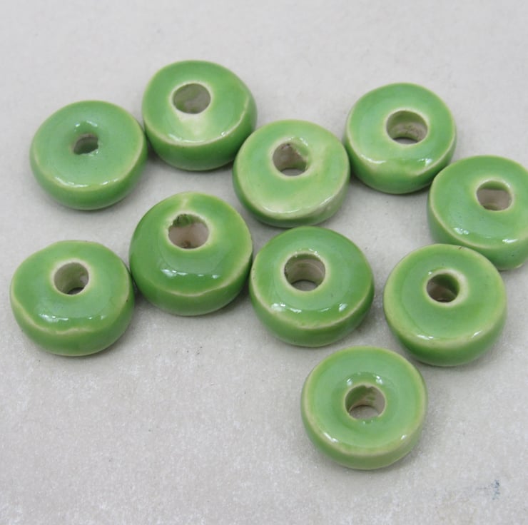 10 Small Apple Green Glazed Ceramic Washer Beads