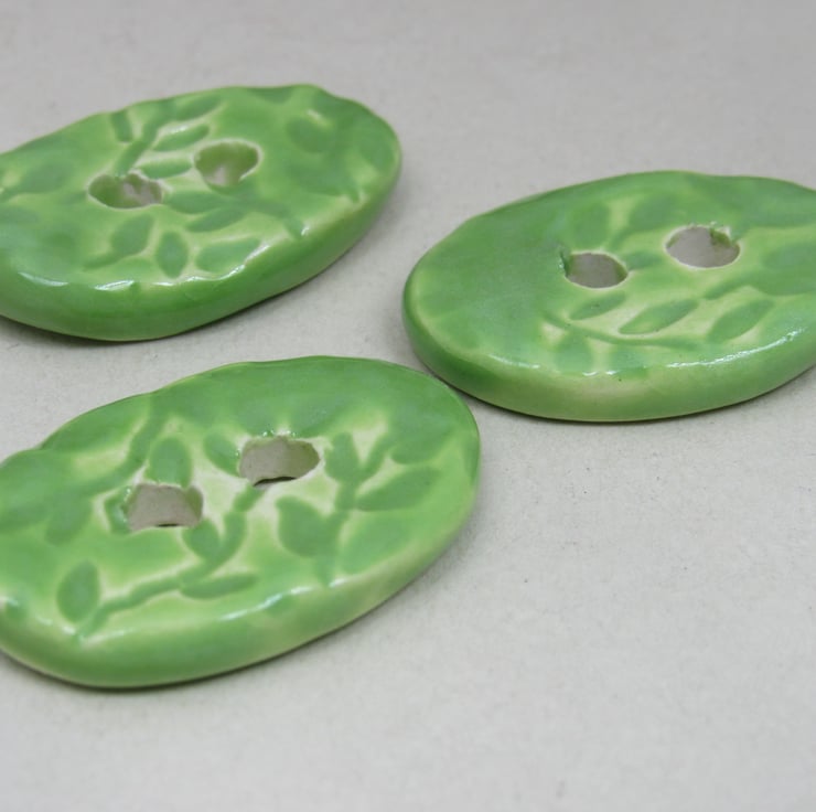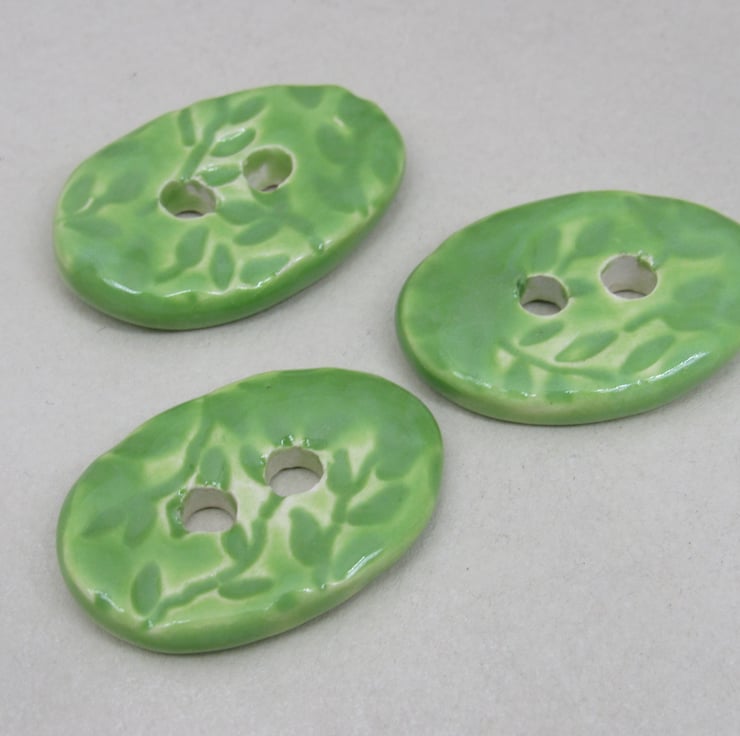 3 medium sized stoneware buttons, with a pretty leaf motif printed into the upper face. Finished with a bright apple green glaze.