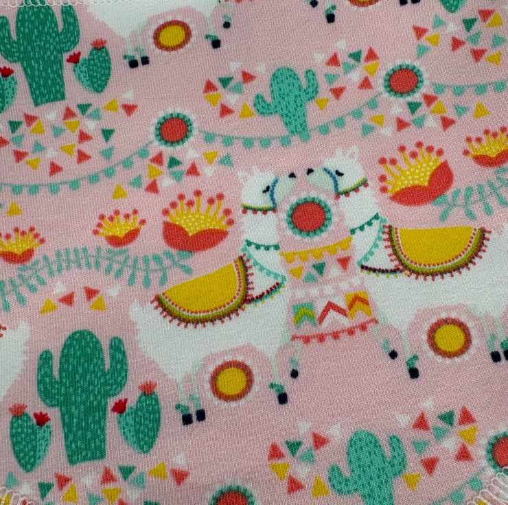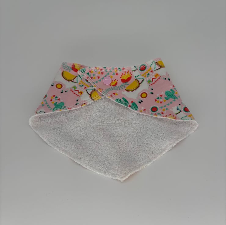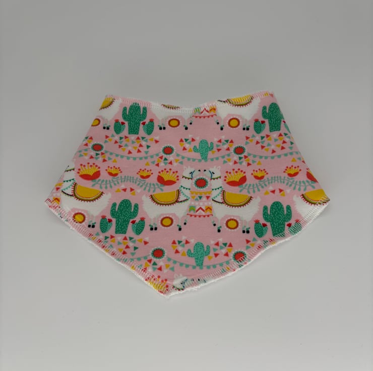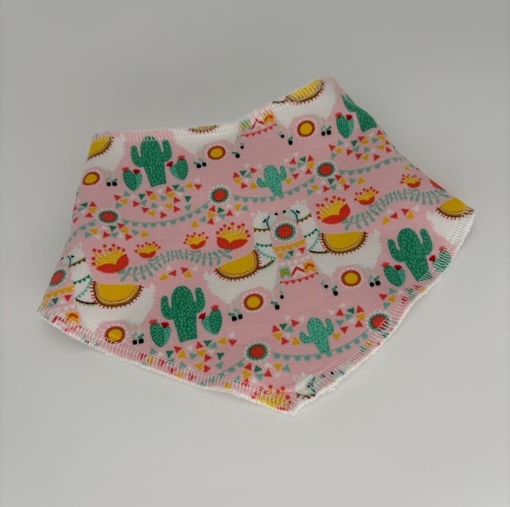 Homemade bandana dribble bib with a Llama and cactus print on a pink background. Bamboo 90% Polyester 10% terry towelling on the reverse. It is absorbent, perfect for drool, teething and mopping up spills.