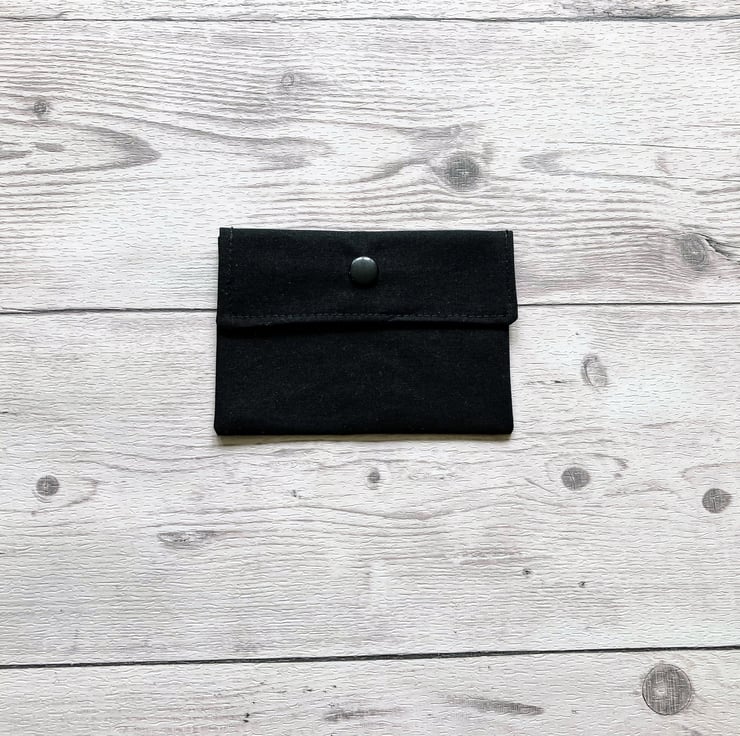 Cotton pouch, lined with a matching cotton and a layer of interfacing in between the fabrics. It features a snap closure to keep your items secure.