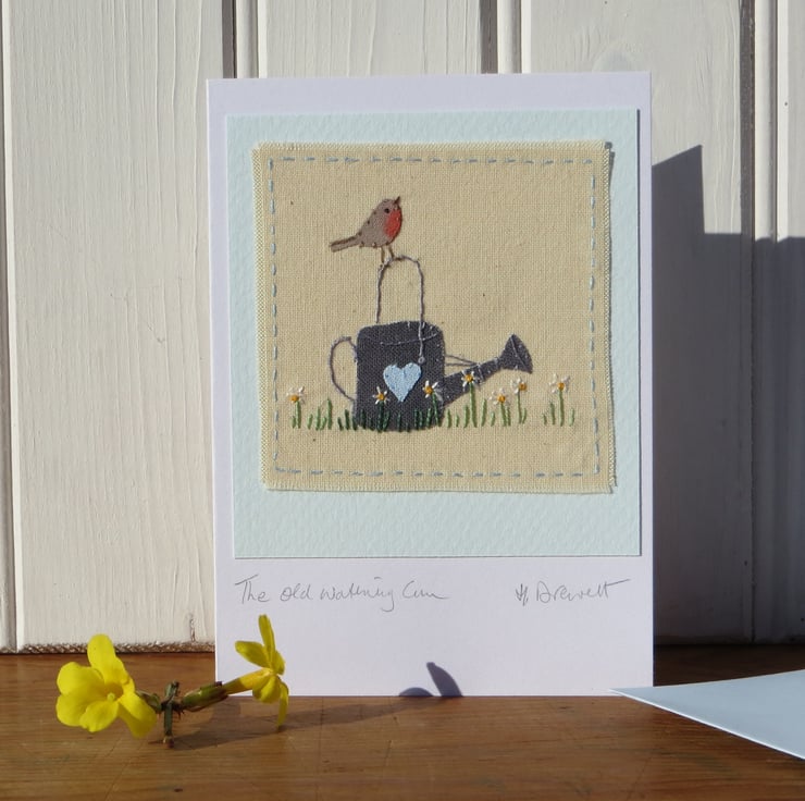 A hand-stitched textile miniature mounted onto greeting card, a gift in itself to keep as well as a card in which to write your message. I have cut the tiny applique watering can by hand and stitched it into position with the addition of embroidered details. A little robin perches on the handle and I have embroidered daisy flowers. I have used my own hand dyed recycled cottons to make this miniature textile.