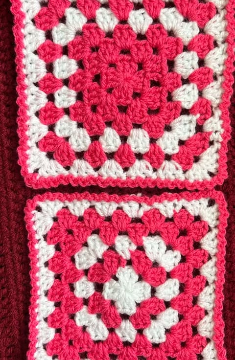 Granny square pattern, White/French fuchsia, approximate length 14cm/ 5.5 inches. Aran yarn, 75% acrylic, 25%wool. Colors may vary slightly due to the camera or monitor.
