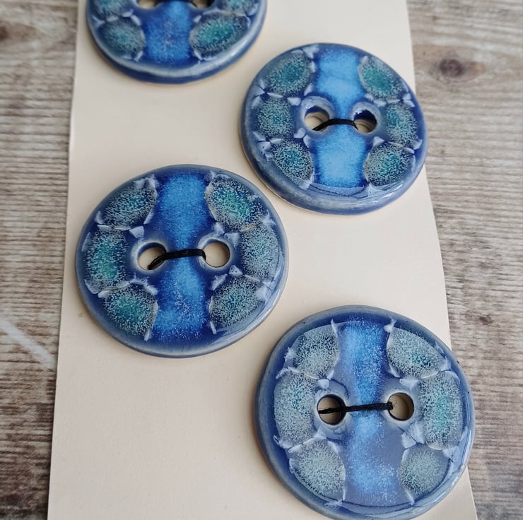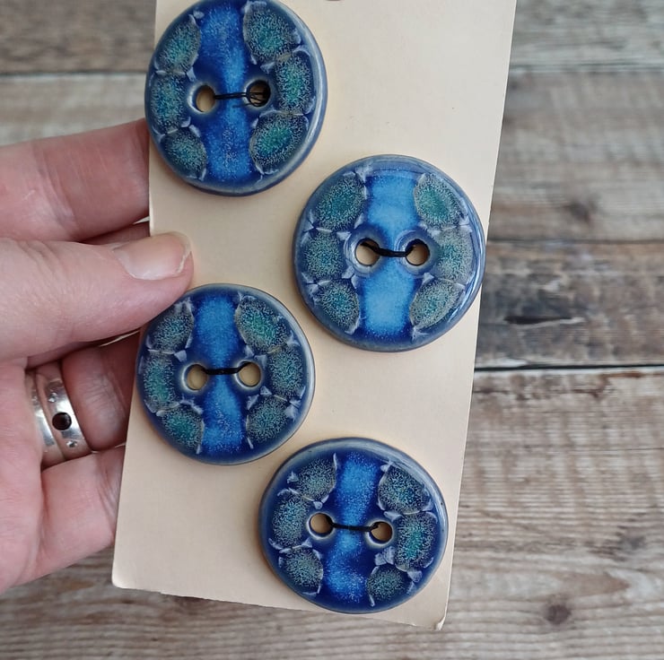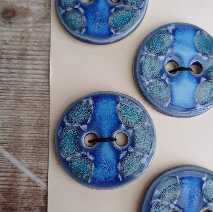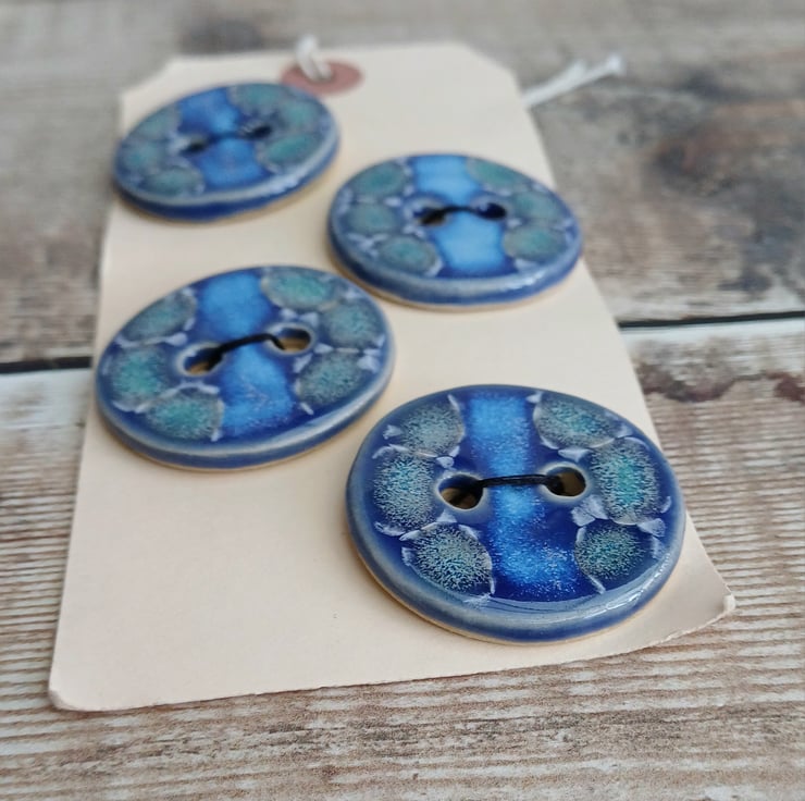 A set of 4 handmade buttons , made from stoneware clay and glazed on one side in shades of glossy blue.