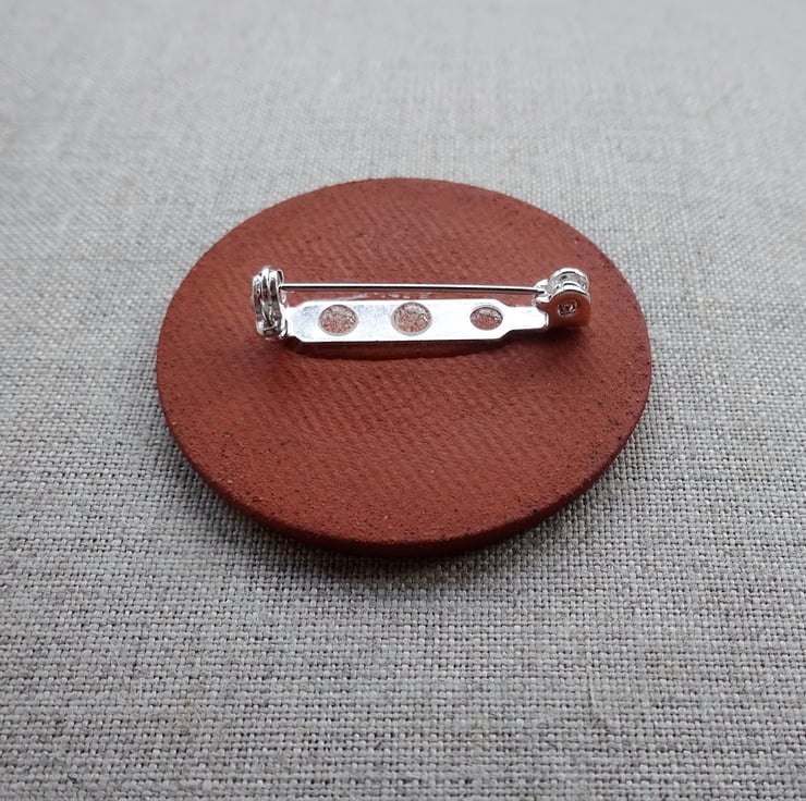 I stayed in North Norfolk on a farm next to the River Glaven. A barn owl arrived every evening sitting on a post by the door. I painted him and placed him inside a medieval style border. I later scanned the original painting and had some decals made. thought it would work well on a brooch so I enlisted the help of a ceramic studio in Cornwall who fired my decals and completed the brooch, all made by hand.