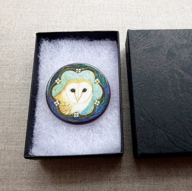 This charming ceramic brooch features my original artwork of a barn owl. It measures one and a half inches diameter and comes complete with a smart black box.